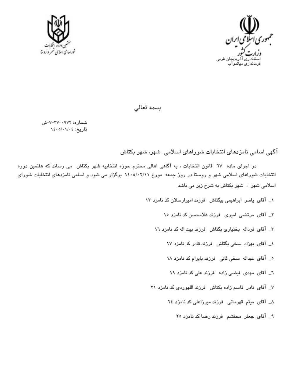آگهی اسامی نامزدهای انتخابات شورای اسلامی شهر بکتاش