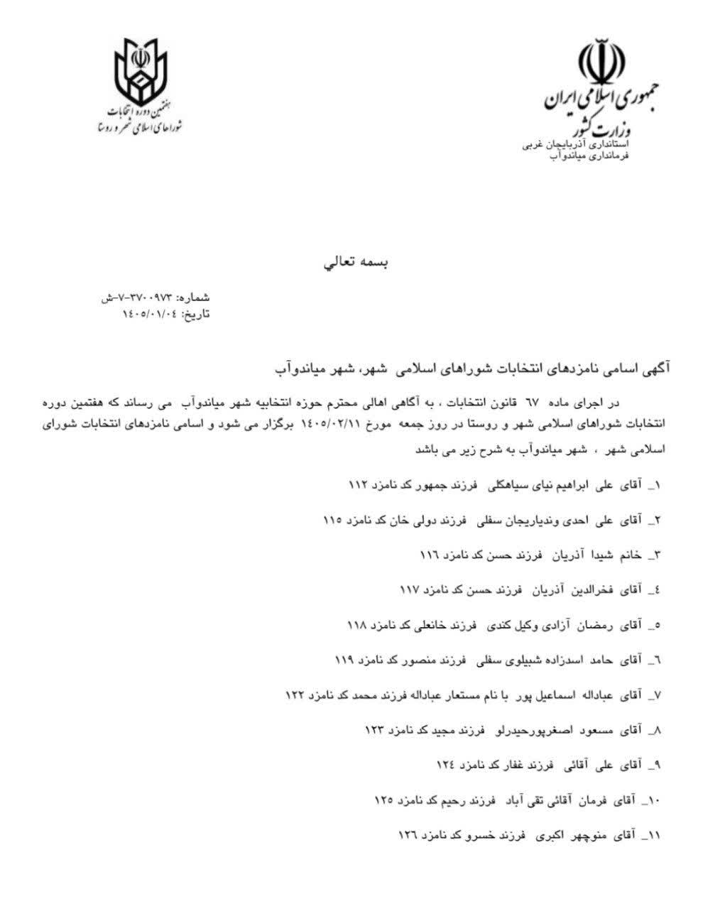 آگهی اسامی نامزدهای انتخابات شورای اسلامی شهر میاندوآب