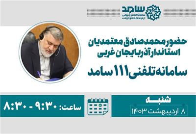 🔻حضور محمدصادق معتمدیان استاندار آذربایجانغربی در سامانه تلفنی 111 سامد 🔹روز شنبه 8 اردیبهشت ماه 1403 🔹از ساعت 8:30 الی 9:30 صبح 🔸هم استانى هاى عزیز می توانند براى ارتباط مستقیم با استاندار آذربایجان غربى روز شنبه 8 اردیبهشت ماه از ساعت 8:30 الی 9:30 صبح با شماره 111 (سامد) تماس و با ایشان گفتوگو نمایند.