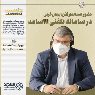 محمدصادق مهتمدیان، استاندار آذربایجان غربی روز چهارشنبه بیستم بهمن ماه 1400 از ساعت 9 الی 10:30 با حضور در سامانه ارتباط مردم و دولت (سامد) و از طریق تلفن 111 بصورت مستقیم پاسخگوی تماس های مردم عزیز استان خواهد بود.