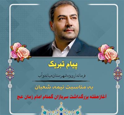 فرماندار ویژه شهرستان میاندوآب با صدور پیامی فرارسیدن نیمه شعبان و هفته سربازان گمنام امام زمان(عج) را تمام آحاد ملت و بویژ] سربازان گمنام امام زمان (عج) تبریک گفت