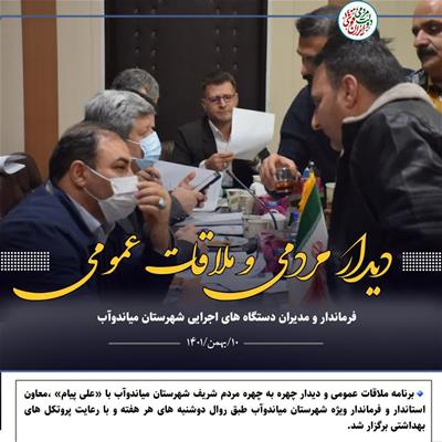 برنامه ملاقات عمومی و دیدار چهره به چهره مردم شریف شهرستان میاندوآب با «علی پیام» ،معاون استاندار و فرماندار ویژه شهرستان میاندوآب طبق روال دوشنبه های هر هفته و با رعایت پروتکل های بهداشتی برگزار شد